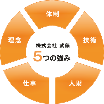個人のお客様 株式会社 武藤の5つの強み お客様に喜んで頂ける仕事をする。 一般のご家庭から、官公庁をはじめとする大規模建築塗装の全工程をワンストップで行える「体制」。様々な用途や機能などオーダーに応じて柔軟に対応できる確かな「技術」。技能検定や作業に必要なスキルアップに挑戦できる体制を構築した「人財」づくり。塗装だけでなく各種防水工事やコンクリート建物の改修工事などを通じて地元のインフラを支える「仕事」。そして、先代から現社長へと受け継がれるどこまでも会社のNO.1営業マンであり、技能者であり続ける誇りと「理念」。 この5つが株式会社 武藤の強みです。すべてはお客様に喜んで頂くため、従業員一同誠心誠意ニーズにお応えして参ります。